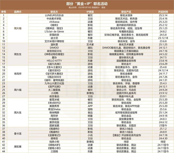 依托黄金行业财报中透露的趋势,不完全统计了目前在“黄金谷子”赛道布局较多的黄金珠宝品牌及其具体的IP联名情况: