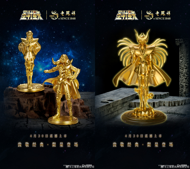 在此背景下,IP联名成为破局关键。例如,周大福与Chiikawa联名的转运珠发售当日即脱销,迪士尼系列累计销量超200万件;五一期间,老凤祥与《圣斗士星矢》推出的联名产品上市短短两周,系列产品已创下近亿元销售,其中最受关注的666克黄金手办售价88万元,限量30件被抢购一空,黄牛市场的手办单件溢价甚至攀至百万级。