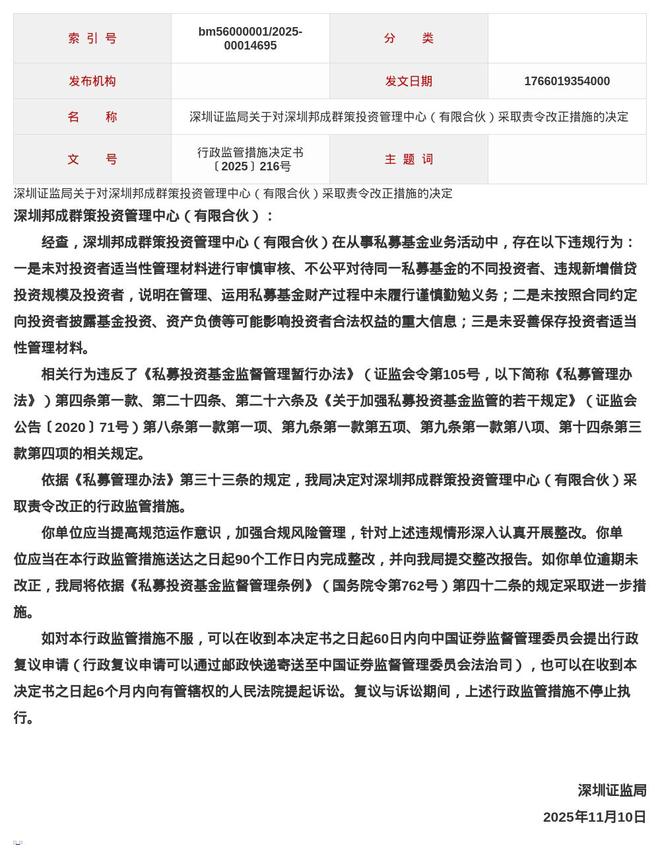 针对以上问题,深圳证监局决定对深圳邦成群策投资管理中心(有限合伙)采取责令改正的行政监管措施。