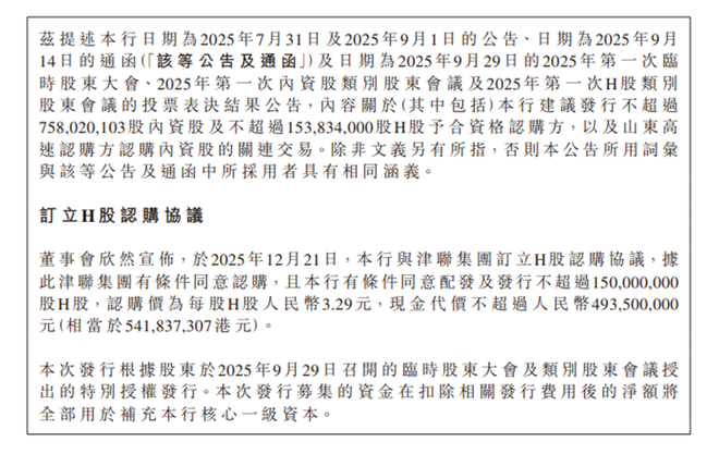 茶壶财经12月22日讯(记者 金磊)近日威海银行公告,2025年12月21日,该行与津联集团订立H股认购协议,拟向津联集团发行不超过1.5亿股H股,募集资金净额将全部用于补充该行核... 茶壶财经12月22日讯(记者 金磊)近日威海银行公告,2025年12月21日,该行与津联集团订立H股认购协议,拟向津联集团发行不超过1.5亿股H股,募集资金净额将全部用于补充该行核心一级资本。