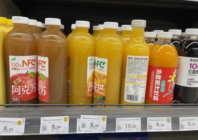 界面新闻走访盒马时看到,盒马不仅有100%橙汁、苹果汁,还有山楂汁、白桦树汁、小青柠汁、秋月梨汁等多个差异化的单品,且价格控制在9.9-19.9元之间,此外,这里还有味全、农夫山泉NFC等品牌的果汁产品,消费者可供选择的种类较多。