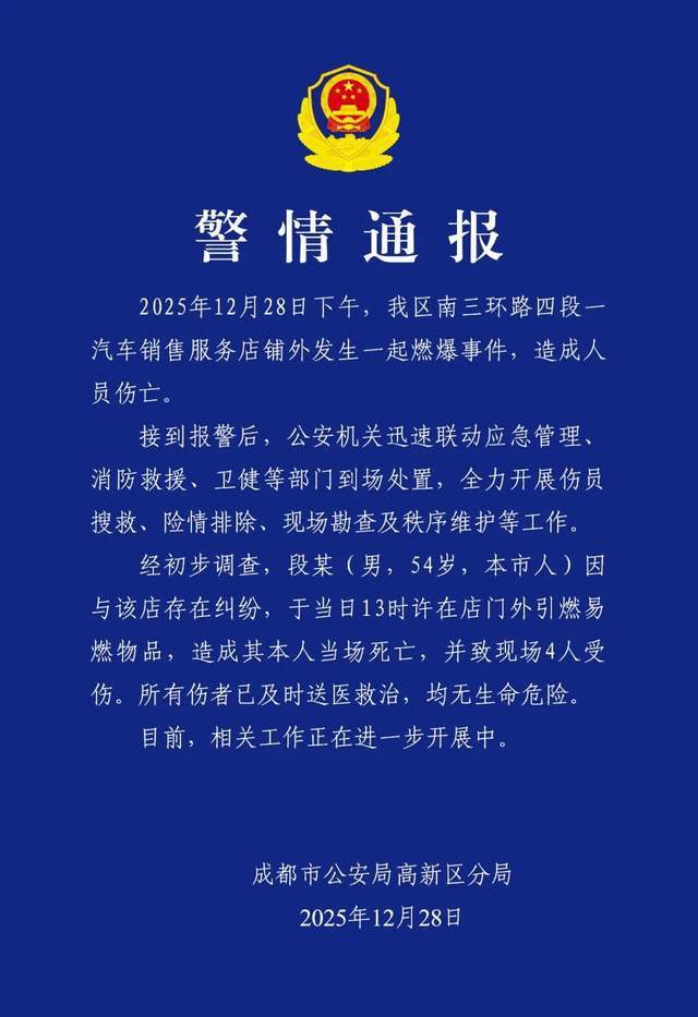 12月28日,成都市公安局高新区分局发布警情通报:12月28日下午,我区南三环路四段一汽车销售服务店铺外发生一起燃爆事件,造成人员伤亡。接到报警后,公安机关迅速联动应急管理、消防救... 12月28日,成都市公安局高新区分局发布警情通报: