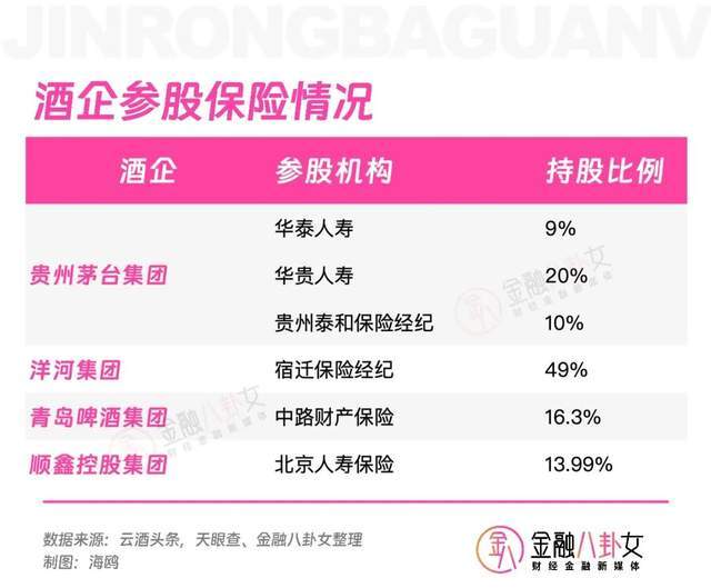 不只是银行,部分酒企还参股了保险、券商等金融机构,如贵州茅台集团持有华贵人寿20%的股份,古井集团持有华安证券2.76%的股份,上海市糖业烟酒(集团)持有兴业证券1.87%的股份等。