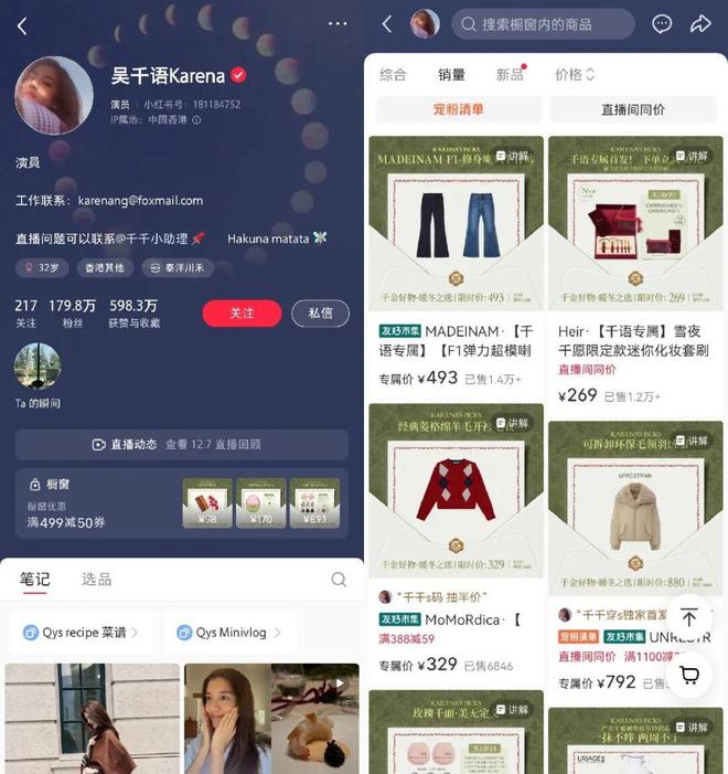 她的选品,相较于董洁、章小蕙更为综合,既有前者主攻的服饰,也囊括后者主推的国际小众护肤化妆品。同时,吴千语的出现,呼应了年轻女性既要事业成就感,也要生活掌控感的复合诉求。她展现事业与情感平衡的轻盈感,让用户觉得这种生活我也能靠近。