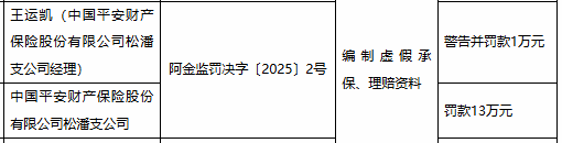 平安财险松潘支公司被罚13万,涉编制虚假承保、理赔资料