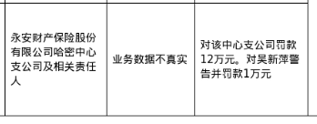 罚单显示,永安财产保险股份有限公司哈密中心支公司的违法违规事实为:业务数据不真实。