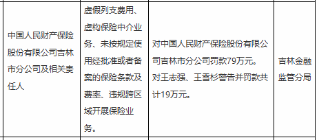 人民财险吉林市分公司被罚79万,责任人共被罚19万