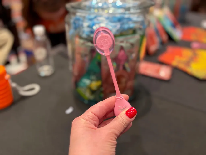如果说 CES 是严肃技术与怪点子并存的地方,那 Lollipop Star 大概就是后者的典型代表。这不是一颗普通的棒棒糖,而是一款能在你嘴里"播放音乐"的甜点。撕开塑料包装,拿在手里的首先是一根看起来略显"科技感"的棒棒糖:一端是糖,另一端的棍子底部鼓起了一小块,里面藏着电子元件和开机按钮。工作人员提醒,需要配合他们提供的耳塞使用——你一边吃着糖,一边通过骨传导听歌,很难不怀疑这究竟算是零食、玩具,还是某种可穿戴设备的变体。