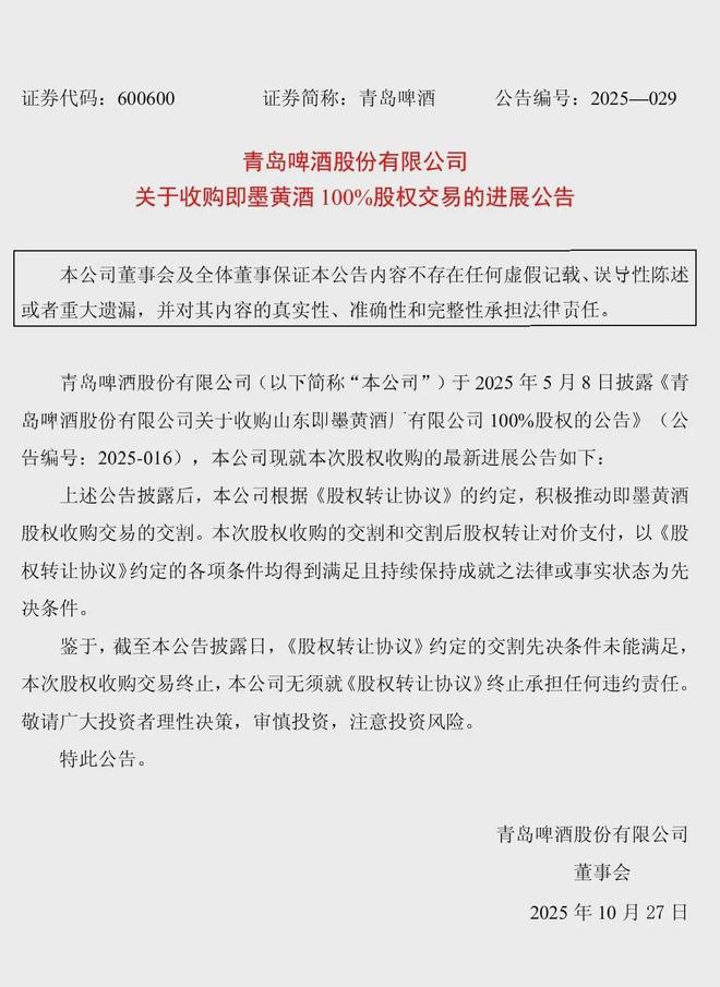 图片来源:青岛啤酒公告截图