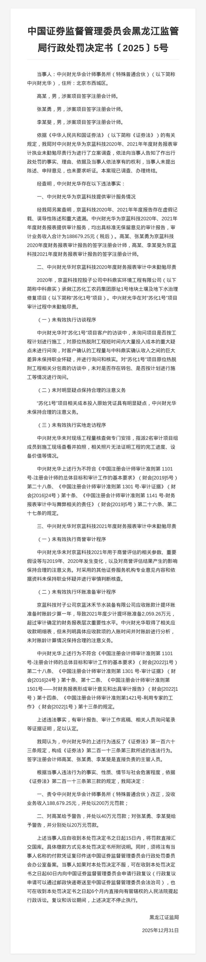 中兴财光华会计师事务所被罚200万,涉审计京蓝科技违规