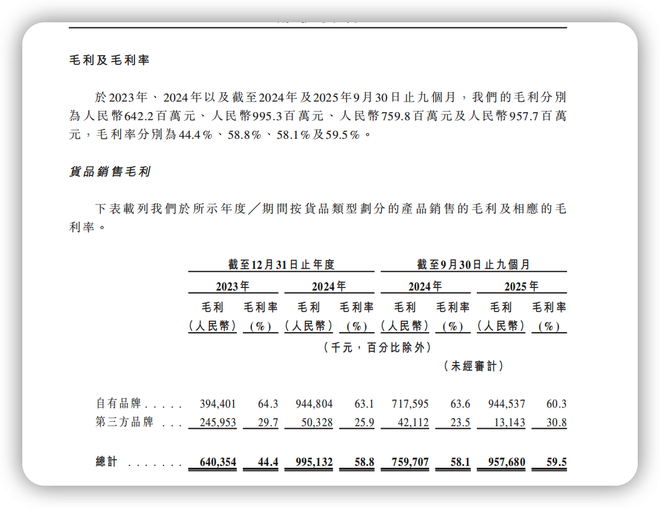 公司解释毛利率改善与业务结构变化相关:招股书披露,公司的自有品牌收入从2023年的约6.14亿元提升至2024年的约14.98亿元,占比从42.4%升至2025年前三季度的97.3%。