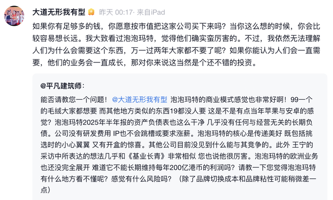 近日,知名投资人段永平(ID:大道无形我有型)在雪球上回应网友提问时,再度谈及对泡泡玛特的看法。