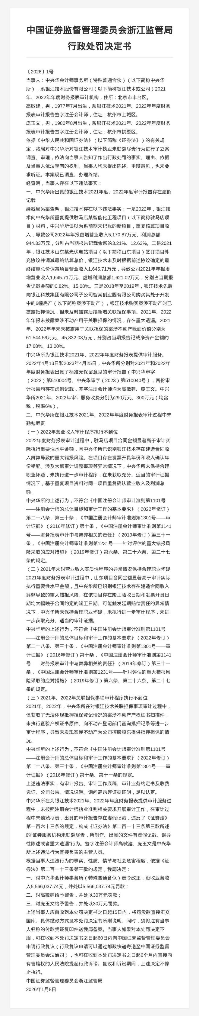 决定书显示,当事人存在以下违法事实:中兴华所为银江技术2021年、2022年年度财务报表提供审计服务,两份审计报告均存在虚假记载,签字注册会计师均为高敏建、庞玉文,中兴华所2021年、2022年审计服务收费分别为290万元、300万元(均含税,税率6%);中兴华所在银江技术2021年、2022年年度财务报表审计过程中未勤勉尽责。