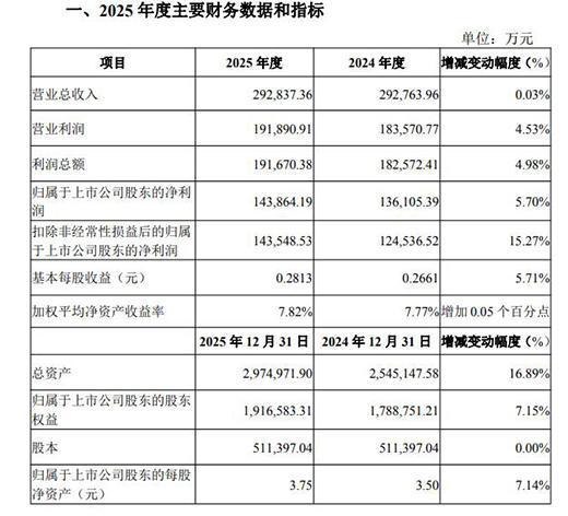 数据显示,该公司2025年实现营业总收入29.28亿元,同比微增0.03%;归母净利润14.39亿元,同比增长5.70%,扣非后归母净利润同比增幅更高达15.27%。