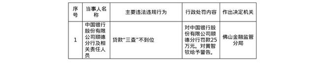 中国银行顺德分行被罚25万,涉贷款“三查”不到位