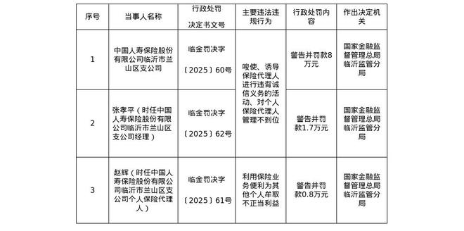 针对这些行为,国家金融监督管理总局临沂监管分局对其警告并处以8万元罚款;对时任中国人寿保险股份有限公司临沂市兰山区支公司经理的张孝平,警告并处以1.7万元罚款;对时任个人保险代理人的赵辉,警告并处以0.8万元罚款。![]()