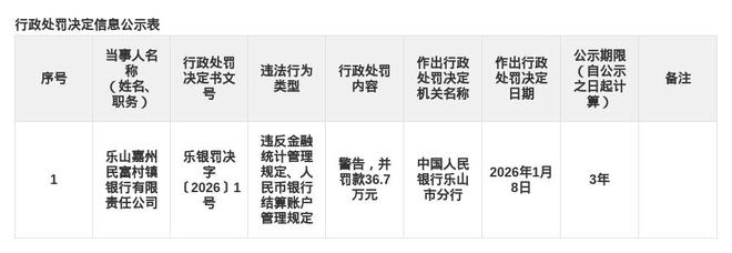 乐山嘉州民富村镇银行被罚36.7万,涉违反金融统计管理规定等