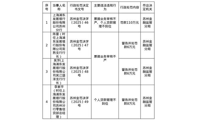 针对上述违法违规行为,国家金融监督管理总局苏州监管分局对其罚款110万元;对陈雷(时任上海浦东发展银行股份有限公司常熟支行行长)警告并处罚款6万元;对吴萍(上海浦东发展银行股份有限公司吴江盛泽支行行长)警告并处罚款6万元;对李家平(时任上海浦东发展银行股份有限公司苏州分行零售信贷部总经理)警告并处罚款8万元。![]()